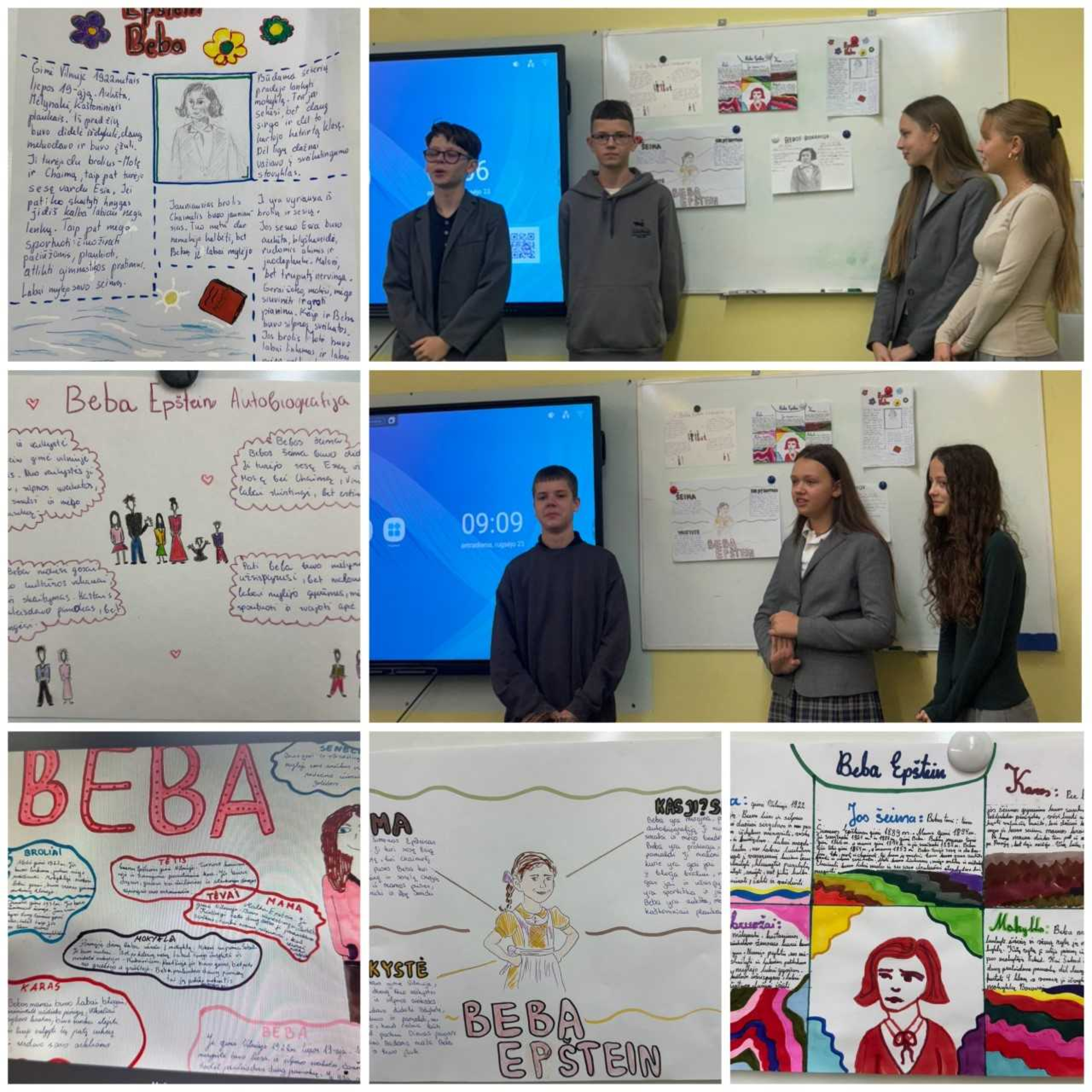 On September 23, students from the Alytus St. Benedict Gymnasium, Alytus Lithuania, commemorated National Memorial Day for the Genocide of Lithuanian Jews with a series of posters inspired by YIVO’s online exhibition, Beba Epstein: The Extraordinary Life of an Ordinary Girl, translated into Lithuanian with the support of the Lithuanian Ministry of Foreign Affairs. The first exhibition in the YIVO Bruce and Francesca Cernia Slovin Online Museum, The Extraordinary Life of an Ordinary Girl explores East European Jewish life in the 20th and 21st centuries through the true story of Beba Epstein, whose autobiography is the centerpiece of the exhibition. Irena Leščinskienė, Deputy Director for Education and Lithuanian Language and Literature Teacher at Alytus Gymnasium, was introduced to Beba’s story and the online exhibition during a Teacher’s Training Program led by YIVO in Lithuania in June 2025.