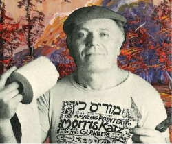 “Katz was a genuine performance artist,” said curator, Eddy Portnoy, “and his standard routine would be to line up two dozen canvases and paint them all within the span of an hour – using only a palette knife and toilet paper – all the while cracking jokes and explaining his craft to rapt audiences.” Katz took this “show” annually to the Catskills, where he performed for years and where he made much of his living.
